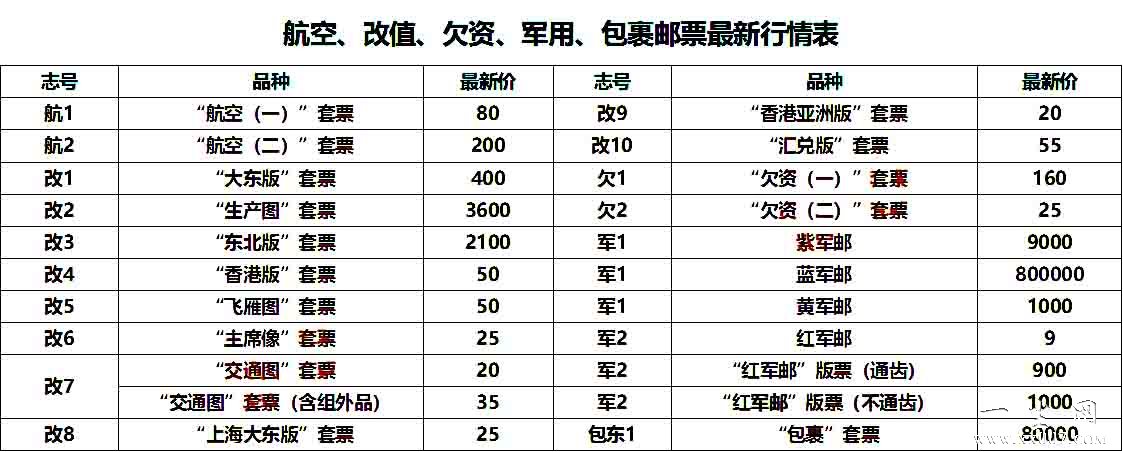 航空、改值、欠资、军用、包裹邮票最新行情表