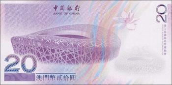 北京2008年奥运会澳门币纪念钞票背面。