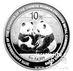 该套金银纪念币背面图案均为双熊猫图,并刊“中国现代贵金属纪念币发行30周年纪念”英文字样及成色、重量和面额。