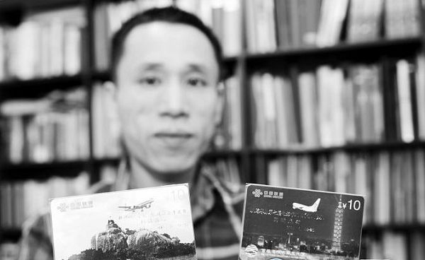 除了收藏,吴远斌还自己设计发行电话卡:“我是学建筑的,对设计东西非常感兴趣。另外,我也有些虚荣心,希望刻有自己名字的电话卡让别人收藏。”从2000年开始,他单独或与别人合作,共设计了几十种电话卡。在这些卡中,最珍贵,也最有纪念价值的当数为纪念海峡两岸飞行直航而设计的电话卡。这张以厦门鼓浪屿为主题的电话卡,不仅显示出老吴的设计技巧,还寄托着他对两岸人民友谊发展的美好愿望。