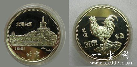 年中国人民银行发行中国辛酉(鸡)年生肖金银币一套,金币为8克,直径23毫米,面额250成色91.6%,发行量5000枚,银币为15克,直径33毫米,面额30元,成色85%,发行量10000枚,均有沈阳造币厂铸造。“中国辛酉(鸡)年生肖纪念币正面镌有“北京”二字及发行年号,建筑图案选用中国著名古代皇家宫苑——北京北海白塔景观。北海位于中国北京市内中南海北侧,总面积约70余万,曾系辽、金、元、明、清历代帝王之“御花园”,迄今已具800余年历史。白塔为其主要建筑之一,耸立于琼华岛之颠。清顺治八年(公元1651年)始建,清康熙十八年(公元1679年),清雍正九年(公元1731年)两度重建。该塔为喇嘛塔,高35.9年,周长约72米,下为高大砖石台基,塔座系折角式须弥座,上承覆钵式塔身,正面有壶门式眼光门,内镌藏文咒语。塔身上部为细长之十三天相轮,再上面有铜质华盖两层,边缘系铜钟14层,顶端为鎏金火焰宝珠塔刹。该塔形制渊源于古代尼泊尔宗教建筑。故此,其又被视为中国传统建筑艺术与外来建筑造型艺术相融合之结晶。