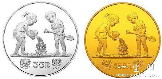 1976年发行的《国际儿童年》纪念币分为金币和银币,规格有:1盎司、1/2盎司银币,银币直径均为36毫米,面额均为35元,,金币为1/2、1盎司,直径均为27毫米,面额均为450元。《国际儿童年》银币是中华人民共和国成立以来发行的第一枚银币。每枚银币含银15.5克,这在我国所发行的银币中是绝无仅有的。1盎司银币和1盎司金币又称为加厚币,均是非常难得的珍品,非常稀有,被广大钱币爱好者所珍视。 《国际儿童年》纪念币图案设计活泼生动,寓意深远。币面上两名儿童正精心浇灌一株盛开的花,寓意儿童是人类的未来,有如娇嫩可爱的花朵。需要人们予以重视、关心和支持。哥斯达黎加发行的纪念银币,画面上有三只小鸟,在巢中翘首盼望、嗷嗷待哺,非常生动。