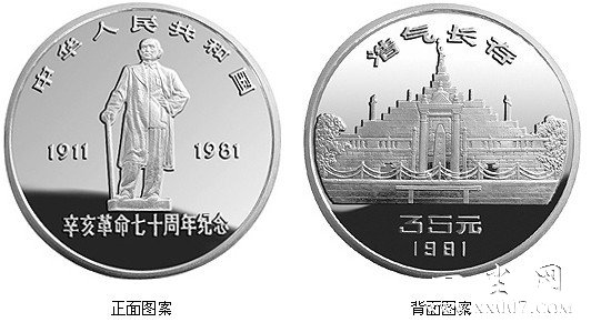 年10月,为纪念辛亥革命70周年,中国人民银行授权所属中国造币公司铸造发行一套纪念币,其包括一枚金币和一枚银币。银币发行量4000枚。“辛亥革命70周年”银币的正面画面的结构,分为上、中、下3个区域,中间区域,又有左、中、右之分,上者是“中华人民共和国”的环形文字,很大气,也很庄重。下者为“辛亥革命七十周年”的中文字样,很简洁,很凝练。中间区域,左侧是辛亥革命起义的年份“1911”,右侧为纪念银币发行年份“1981”,这种排列,有似紧随孙中山之后,左冀与右冀浩浩荡荡的革命大军。立在正中的,是旗手孙中山。设计者在设计过程中,有意把雕塑孙中山做成仰视之状,也不是高仰之势,只是抬头可观的那种。这种角度,应该是经过深思熟虑的,如果过高,产生距离感,拉大了民众与领袖的关系。如果过低,则表现不了民众对领袖的敬仰之情。这种恰到好处的微仰,既掩饰了孙中山身材方面的不足,又把大家对领袖的敬慕情感表现了出来。“辛亥革命70周年”银币背面图案为黄花岗七十二烈士墓,镜面为底衬,银币上部凸雕“浩气长存四”个大字,中间部位是烈士墓,真个不眠给人以庄严肃穆宁静的感觉。