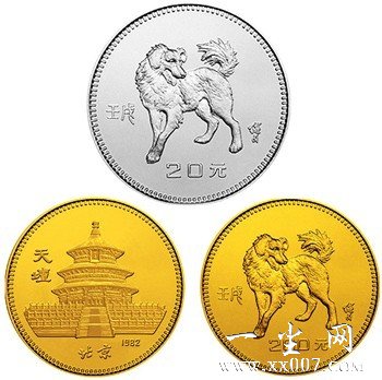 1982年发行1982中国“壬戌狗”金银纪念币一套。该套金银币共有1金1银2枚金银币,均为中华人民共和国法定货币。8克圆形金币面额150元,直径23mm,成色91.6%,发行量为5000枚。 15克银币面额10元,直径33毫米,成色85%发行量10000枚,银币与金币图案相同。该币背面图案采用著名画家刘继卣专门为金银币创作的“立犬图”, 画家从细处入手,寓动于静,以简洁的构图,厚重的笔触,描绘出一只呼之欲出的传神之犬。虽画面上只有一只单立犬,但半张的嘴,高竖的尾,以及抬起就能疾驰的四腿,形象生动,将动物旺盛的生命力,表现得淋漓尽致。以王福德大师炉火纯青的雕刻设计,运用高、浅浮雕工艺、喷砂工艺和线刻手法巧妙地融合,把“立犬图” 形神兼备的展现在金银币方才之间,终于成就了这世界级的华美乐章。