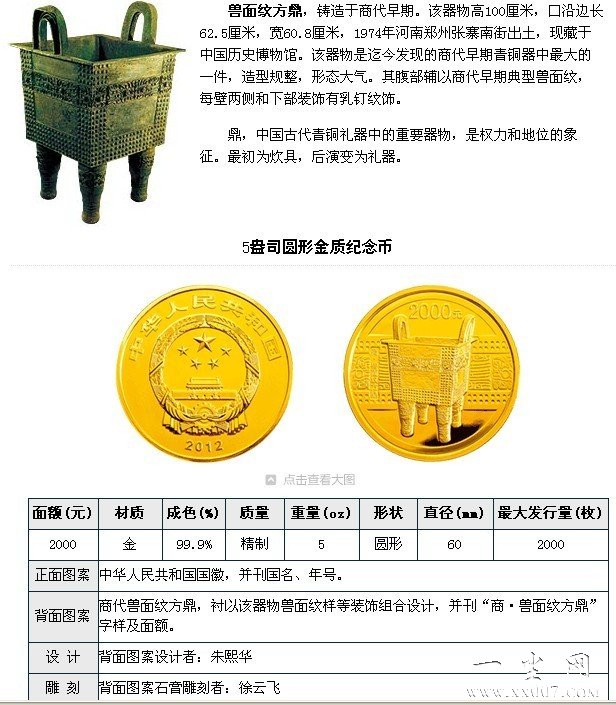 中国青铜器金银纪念币(第1组)5盎司金币简介