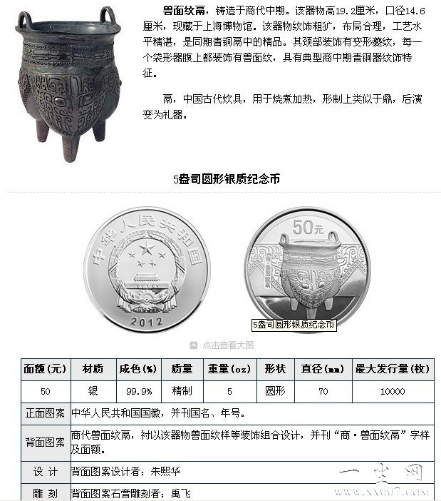 中国青铜器金银纪念币(第1组)5盎司银币简介