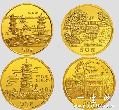 1990年发行台湾风光金银纪念币(第1组)一套。该套金银币共有4枚1/2盎司金币,均为中华人民共和国法定货币。1/2盎司圆形金币(日月潭慈恩塔)正面图案: 长城 背面图案:日月潭慈恩塔。精制币;面额50元,直径27mm,成色99.9%,发行量为4000枚。