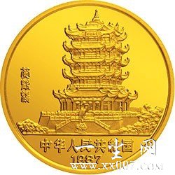 金银币上的黄鹤楼为正面造型,布局略有侧重,以篆书“黄鹤楼”3字平衡画面,国名“中华人民共和国”及年份“1987”刊于币面下端。全图气势恢宏,气象万千。在第5层檐下,一块巨大的“黄鹤楼”匾额格外醒目。原书出自舒同手迹。