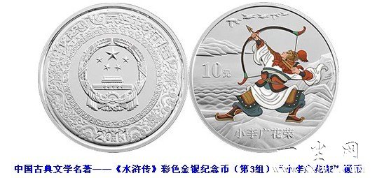 中国人民银行于2011年11月发行中国古典文学名著《水浒传》彩色金银纪念币第3组,1盎司银币背面图案之一为小李广梁山射雁。该场景选自《水浒传》第三十五回《石将军村店寄书 小李广梁山射雁》。