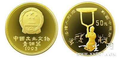 年发行的中国出土文物(青铜器)第3组中有一枚1/2盎司的金币,其是以漆绘人形灯为图案。漆绘人形灯是1975年河南省三门峡市上村岭出土文物。该灯高48.9厘米,形状为一人双手举灯。只见币画中的举灯之人跽坐,挽髻束冠,面容恬静恭谨。身穿着长袍,束宽腰带。双手托举叉形灯拄,上面是一圆形灯盘。整尊像的线条流畅之极,举灯人动作显得极为轻松自然优雅。这种设计,应为当时所流行的举重活动在生活中的反映。币中以四个姿态各异的人物塑像为背景,更好地突出了灯具照明的作用——方便人们从事各种各样的活动。这漆绘人形灯不但反映出我国古代灯具的设计已经具有相当的水平,还体现了我国古代人民的精湛的雕塑技术。