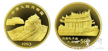 该币为精制币正面图案为长城,背面图案是台南孔子庙大成殿,重量为1/2盎司,直径27毫米,面额50元,成色99.9%,发行量为1000枚。