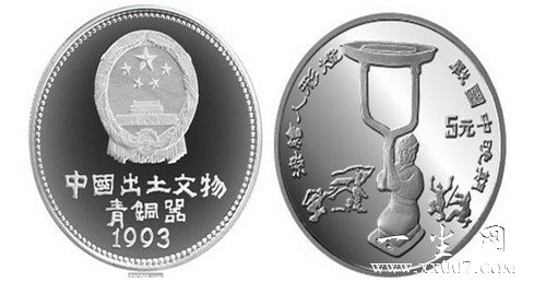 年发行的中国出土文物(青铜器)第3组中有一枚15克的银币,其是以漆绘人形灯为图案。漆绘人形灯是1975年河南省三门峡市上村岭出土文物。该灯高48.9厘米,形状为一人双手举灯。只见币画中的举灯之人跽坐,挽髻束冠,面容恬静恭谨。身穿着长袍,束宽腰带。双手托举叉形灯拄,上面是一圆形灯盘。整尊像的线条流畅之极,举灯人动作显得极为轻松自然优雅。这种设计,应为当时所流行的举重活动在生活中的反映。币中以四个姿态各异的人物塑像为背景,更好地突出了灯具照明的作用——方便人们从事各种各样的活动。这漆绘人形灯不但反映出我国古代灯具的设计已经具有相当的水平,还体现了我国古代人民的精湛的雕塑技术。