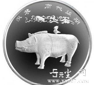 年发行的中国出土文物(青铜器)第3组中有一枚15克的银币,其是以豕尊为图案。豕尊,商后期,容酒器,俗称猪尊,1981年出土于湘潭县九华乡桂花村船形山一个叫“金盆养鲤”的地方。用豕的形象作器形,在古代青铜器中是极其个别的。豕的两眼圆睁状,两耳成招风状,长嘴上翘微张,犬齿尖长,背上鬃毛竖起,四支刚健,臀、腹滚圆,生殖器刻画仔细,活脱脱一头野公猪形象。我们再仔细看,头部阴刻兽面纹,腹、背、盖面为鳞甲纹;四肢和臀部饰倒立的夔纹,夔首反顾,夔尾盘曲,并以云雷纹填饰;盖孔呈椭圆形,腹空,实测容积为13升。该器前后肘部的圆孔分别为21和21.5厘米,直径1.4厘米,两边对穿,腹内为圆管状,是供抬绳穿系而特意设计的,圆管与尊身二次铸成,然后焊接。值得注意的是,该器当年使用过程中曾多次修复,大体有六处:第一处颈、背交接处;第二处,臀部;第三处,盖钮;第四处,左边犬齿;第五处,猪鬃的左侧。从这些修补处,可以感受到当年使用的频繁。