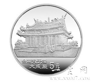 该币为精制币正面图案为长城,背面图案是台南孔子庙大成殿,重量为15克,直径33毫米,面额5元,成色90%,发行量为2000枚。