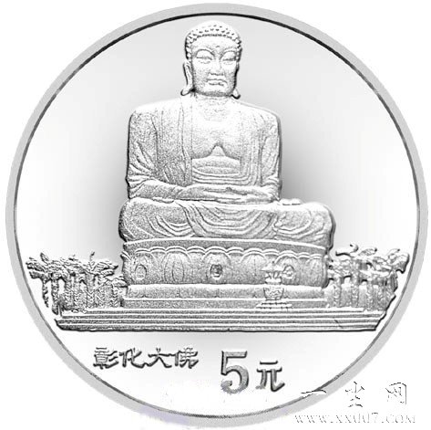 该币为精制币正面图案为长城,背面图案是彰化大佛,重量为15克,直径33毫米,面额5元,成色90%,发行量为2000枚。