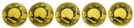 年我国发行了中国古代名画系列金银币,该款金银币共计9枚,其中金币5枚,规格分别是20盎司、5盎司、1盎司、1/4盎司、1/10盎司。5枚币的正面图案为北京故宫太和殿,背面图案均为郎世宁所绘的《孔雀开屏图》。清代宫廷画家郎世宁原是来华传教的耶稣会教士,但他在清廷官封三品,一直忙于为皇帝作画,竟没有机会传教。他善于采纳中国绘画技巧而又保持西方艺术的基本特点。今日全球各大博物馆都有他的作品陈列。孔雀,鸟纲,雉科。我国产的为绿孔雀。雄鸟体长2.5米。羽色绚烂,以翠绿、亮绿、青蓝、柴褐等色为主,多带有金属光泽。为上覆羽延长成尾屏,上具五色金翠钱纹,开屏时尤为艳丽。雌鸟无尾屏,羽毛色亦较逊。多栖于山脚一带溪河沿岸或农田附近。以种子浆果等为食。在我国云南西南部和南部生长。属国家一级保护动物。