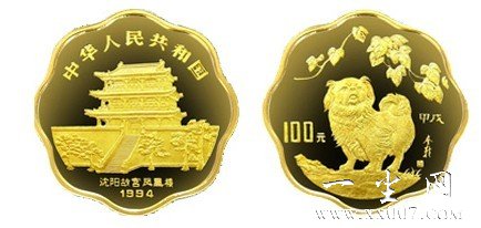 ![]() 1994 年我国发行了以生肖狗为题材的金银铂纪念币,其中金币4枚,银币4枚,铂币1枚。均为法定货币。其中有一枚正面图案为国徽图案并刊国名、年号,背面图案为刘奎龄所绘狗,面值为100元的1/2盎司梅花形金币。狗,中国古代“六畜”之一。易于驯服,忠于职守,富有耐力,勇猛顽强。是人类日常生活中的得力助手和忠诚伙伴。在人们心目中,狗是忠诚,勇敢的象征。 该币为精制币,重量为1/2盎司,直径27毫米,面额100元,成色91.6%发行量2300枚,由沈阳造币厂锻造。