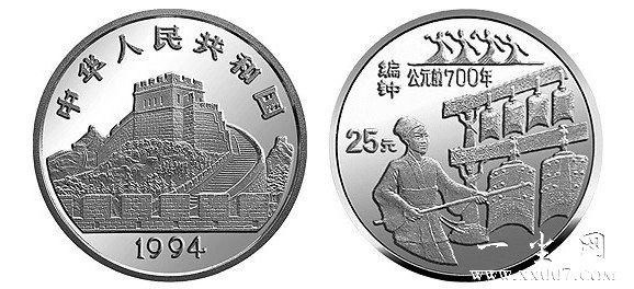 ![]() 1994 年我国发行了古代科技发明发现第3组纪念币,其中有一枚铂币,其背面图案是“编钟”。早 在3500年前的商代,中国就有了编钟,不过那时的编钟多为三枚一套。后来随着时代的发展,每套编钟的个数也不断增加。古代的编钟多用于宫廷的演奏,在民间很少流传,每逢征战、朝见或祭祀等活动时,都要演奏编钟。 该币为精制币,重量为1/4盎司,直径22毫米,面额25元,成色99.95%,发行量为100枚。由澳大利亚造币厂锻造