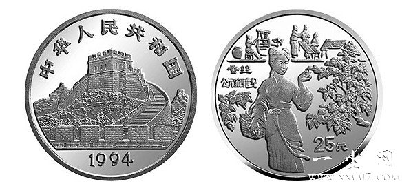 1994年我国发行了古代科技发明发现第3组纪念币,其中有一枚铂币,其背面图案是“蚕丝”。