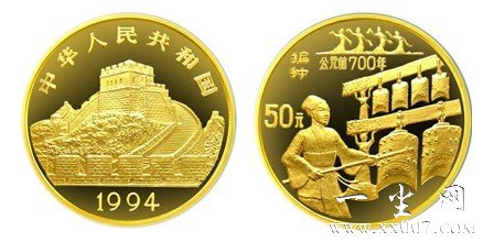 1994年我国发行了古代科技发明发现第3组纪念币,其中有一枚金币,其背面图案是“编钟”。 编钟是中国古代的一种打击乐器,用青铜铸成,它由大小不同的扁圆钟按照音调高低的次序排列起来,悬挂在一个巨大的钟架上,用丁字形的木锤和长形的棒分别敲打铜钟,能发出不同的乐音,因为每个钟的音调不同,按照音谱敲打,可以演奏出美妙的乐曲。引在木架上悬挂一组音调高低不同的铜钟,用小木槌敲打奏乐。 该币为精制币,重量为1/2盎司,直径27毫米,面额50元,成色99.9%,发行量为1200枚。由沈阳造币厂锻造 ![]()