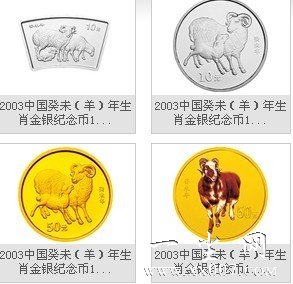 2002年9月20日发行2003中国癸未(羊)年生肖金银纪念币一套。该套纪念币共12枚,其中金币6枚,银币6枚,均为中华人民共和国法定货币。一、纪念币图案