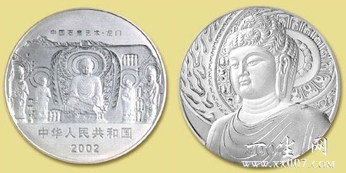 中国人民银行定于2002年4月10日发行中国石窟艺术-龙门石窟金银纪念币一套。该套纪念币共5枚,其中金币2枚,银币3枚,均为中华人民共和国法定货币。