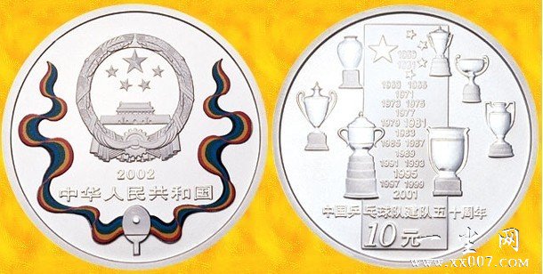 50周年,中国人民银行定于2002年11月8日发行中国乒乓球队建队五十周年纪念银币一套。该套纪念银币共1枚,为中华人民共和国法定货币。一、纪念币图案