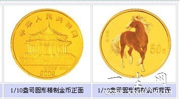 2001年10月26日发行2002中国壬午(马)年金银纪念币一套。该套纪念币共12枚,其中金币6枚,银币6枚,均为中华人民共和国法定货币。现公告如下:一、金银纪念币图案