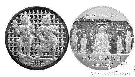 中国人民银行于2002年4月发行中国石窟艺术——龙门石窟金银纪念币一套,其中的5盎司银币的背面图案选取了天王、力士造像。天王、力士,是佛教中的古老形象,而且带有深厚的古印度民间色彩,其文化内涵与十足的异域情调,使它游离于中国早期的佛教美术边缘。随着佛教在中国的传播,外来佛教形式的适应性与中华文明的包容性使其发生了转变——印度佛教把印度的民间诸神变为诸王和金刚力士,而当它们传入中国后,又被中国佛教所改造为天王、力士,变为中国民间信仰的对象。