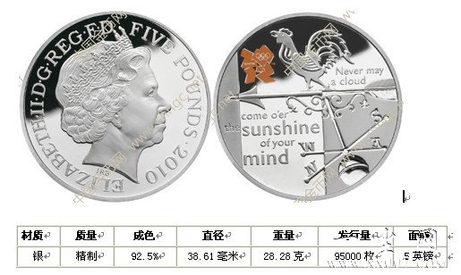 2009年6月起,英国皇家造币厂推出2012年伦敦奥运会官方特许商品——主题为“欢庆英国”的纪念银币项目。该项目共包含18枚银币,分为3大系列,主题分别为“英国记忆”、“英国风情”和“英国精神”。
