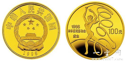 为了纪念这一盛会我国过于1995年发行了第26届奥运会金银纪念币,其中金币2枚,银币6枚,均为法定货币。其中有1枚重量为1/3盎司的金币,其正面图案为国徽并刊年号,背面图案为彩带操图案。