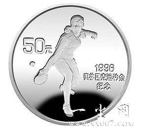 1996年是现代奥运的百年诞辰, 为了纪念这一盛会我国过于1995年发行了第26届奥运会金银纪念币,其中金币2枚,银币6枚,均为法定货币。其中有1枚重量为5盎司的银币,其正面图案为国徽并刊年号,背面图案为乒乓球。 乒乓球是中国的国球,中国在乒乓球历史上占有很高的地位。20世纪60年代以来,中国选手取得 世界乒乓球比赛的大部分冠军,甚至多次包揽整个赛事的所有冠军。 该款银币,为精制币,重量为5盎司,直径70毫米,面额50元,成色99.9%,发行量10000枚,由上海造币厂锻造。