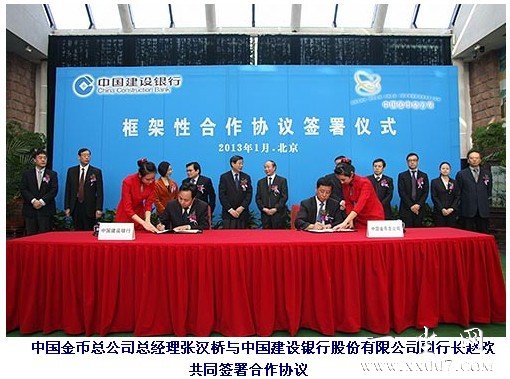 年1月9日根据合作协议,双方将整合资源、共享渠道,进一步密切合作关系,双方同意充分利用各自的业务、网络和客户资源优势,加强以熊猫币为主的贵金属产品的销售、宣传推广及配套服务,在产品销售、价格风险管理、产品回购等方面共同为客户提供更多的私人银行财富管理中心和银行网点服务便利,以及更优质的全面服务。同时,双方还将积极探索在其他金融服务领域,如建行金银加工、定制贵金属产品生产加工、黄金租借等方面的业务合作。