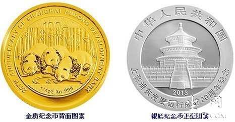 2013年1月8日发行上海浦东发展银行成立20周年熊猫加字金银纪念币一套。该套纪念币共2枚,其中金币1枚,银币1枚,均为中华人民共和国法定货币。一、纪念币图案