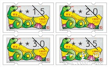 蛇年 (邮资标签)由二零一三年四月三十日早上九时正起,设於澳门36个地点指定的自动售邮票机将会使用新发行之『蛇年』邮资标签。