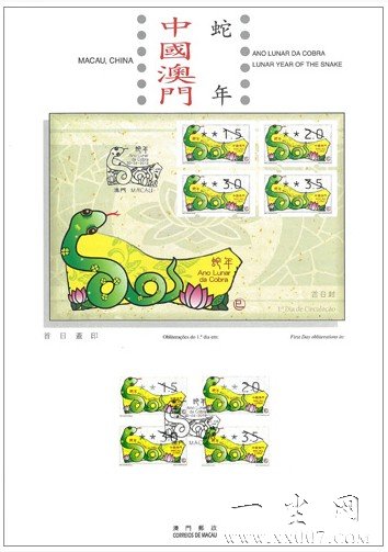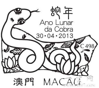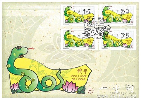 澳门邮政将于2013年4月30日发行《蛇年》(邮资标签)电子邮票,一款四枚邮资标签印有不同面值,分别为1.5元、2元、3元、3.5元。邮票采用防伪纤维纸,照相凹版印刷,邮票规格为43.5*25.4毫米,设计者为冯宝珠。发行当天将推出连邮资标签首日封,规格114 x 162 毫米(C6),售价10元澳门币。另有连邮资标签资料单张,规格297 x 210 毫米,售价15元澳门币。另有首日戳加盖。