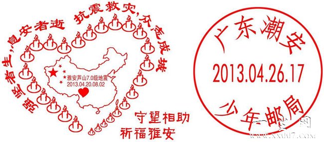 北京时间2013年4月20日8时02分四川省雅安市芦山县发生7.0级地震,雅安地震牵动了全国人民的新,各地纷纷以不同形式关心受灾支援群众。多地推出了雅安地震相关邮戳,纪念这次地震灾害,广东潮安少年邮局也推出了“守望相助 祈福雅安”连体邮戳(上图),邮戳另配以文字“抗震救灾,众志成城”“逝者安息,生者坚强”。