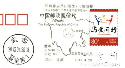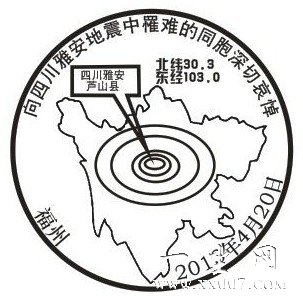 北京时间2013年4月20日8时02分四川省雅安市芦山县(北纬30.3,东经103.0)发生7.0级地震。震源深度13公里。据雅安市政府应急办通报,震中芦山县龙门乡99%以上房屋垮塌,卫生院、住院部停止工作,停水停电。目前已造成186人死亡,另据消息称,雅安芦山地震将受伤人数已突破10000人。中国人民心连心,一方有难八方支援,全国人民与雅安人民站在一起。各地邮政也纷纷推出雅安地震邮戳。以下为四川成都、河南洛阳、湖北武汉、福建福州邮政的雅安地震邮戳。