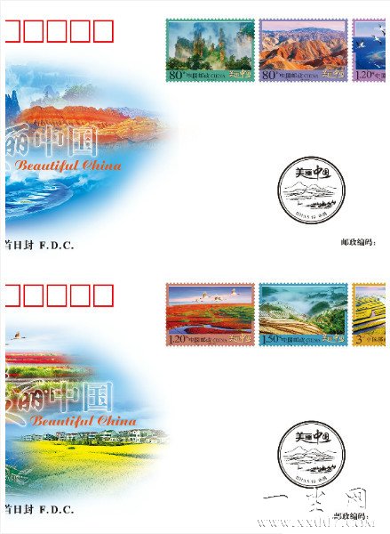配合邮票发行,中国集邮总公司将推出邮票首日封两枚(上图),每枚贴普32《美丽中国》邮票3枚。