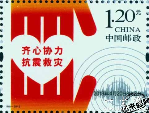 为支援雅安地震灾民,奉献爱心,中国邮政定于2013年5月3日增发雅安地震抗震救灾主题邮票,邮票名称正式命名为《齐心协力 抗震救灾》,此套邮票为特别发行邮票,面值1.20元,印量1000万枚,中国邮政将把邮资收入的1200万元全部捐给地震灾区。