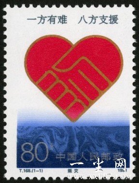 1.1991年9月14日邮电部发行T168《赈灾》特别邮票,面值80分,设计者王虎鸣、赵玉华,发行量40000万。邮票主图上方为“一方有难,八方支援”8个字,之下为在滔滔浇水面前,由两只紧握的手构成一颗红心,寓意为在大自然灾害面前,中国人民表现出大无畏的气概和高尚的道德情怀。抽象的画法,深刻而含蓄地展示了这枚邮票的主题。