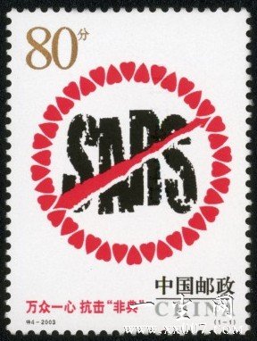3.2003年5月19日国家邮政局发行特4-2003《万众一心 抗击“非典”》特别发行邮票,邮票面值80分,发行量1250万枚。在中国人民齐心协力抗击“非典”的关键时刻,为了表达对战斗在抗击“非典”斗争第一线的“白衣天使”的崇高敬意,国家邮政局增发此套邮票,记录下中国人民在这场突如其来的灾害中团结一心、英勇斗争的历史壮举。