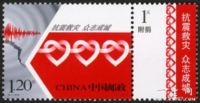 4.2008年5月20日国家邮政局发行特7-2008《抗震救灾 众志成城》特别发行邮票,邮票面值1.20元,另有1元附捐资费。邮票发行量1300万枚,2008年5月12日14时28分04秒,四川汶川、北川发生里氏8.0级地震,地震造成69227人遇难,374643人受伤,17923人失踪。此次地震为新中国成立以来国内破坏性最强、波及范围最广、总伤亡人数最多的一次地震,被称为“汶川大地震”。为表达对地震灾区人民的关怀,国家邮政局发行了《抗震救灾众志成城》邮票,这套邮票的画面表现了全国各族人民在严重的地震灾害面前手拉手、心连心,众志成城的坚定意志和无私奉献精神。