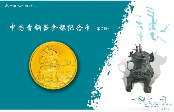 青铜器(2组)1/4盎司圆形金币背面图案司妇好鸮尊 .铸于商代晚期,是迄今发现的最早的鸟形酒尊之一。1976年河南省安阳市殷墟妇好墓出土,现藏于中国社会科学院考古研究所。妇好为商王武丁的配偶。该器物高49.5厘米,以鸮为原型,宽喙高冠,圆眼竖耳,头部略扬,挺胸直立,双翅敛羽,两足粗壮有力,同垂地的宽尾构成一个平面,给人沉稳之感。鸮首后部有一呈半圆形的盖子,其上饰以立鸟及龙形钮。装饰着兽首的鋬(即把手)安在鸮背。妇好鸮尊表面花纹满布,喙与胸颈部上饰出蝉纹,高冠外侧饰羽纹,内侧饰倒夔纹,两侧各饰一身双首的怪夔一条,双翅装饰卷曲的长蛇,间杂菱形纹。颈后饰有兽面纹。背后鋬下饰展翅飞翔的鸮纹,纹饰繁复不穷。