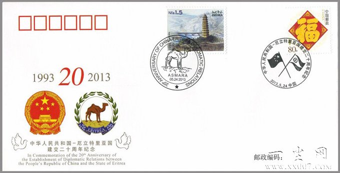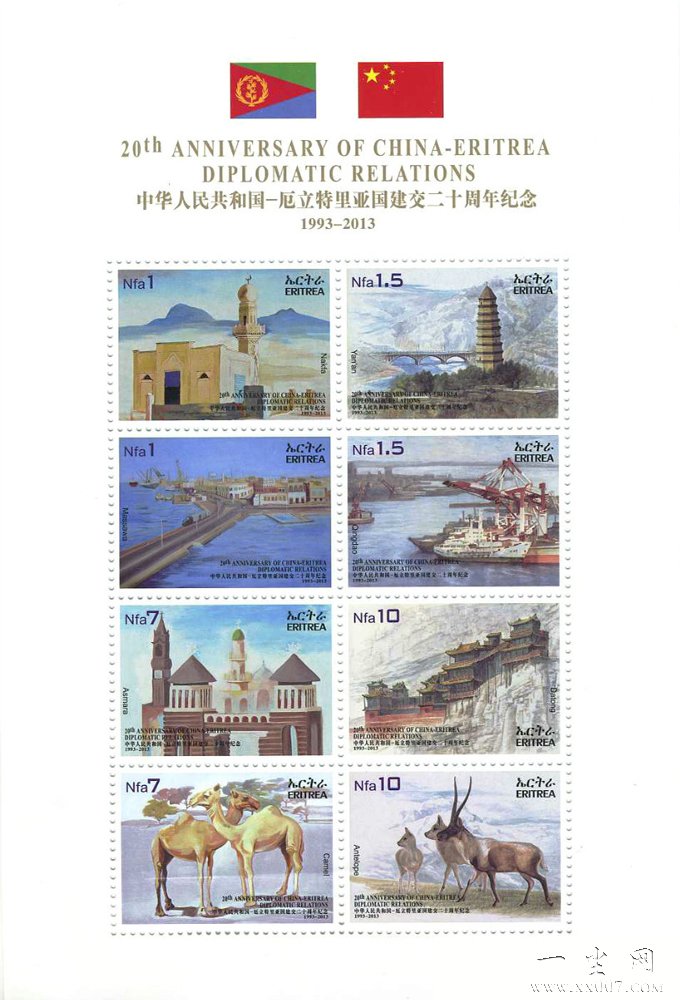 5月24日是中国与厄立特里亚建交20周年纪念日,为纪念这一特殊时刻,厄立特里亚特别发行中厄建交20周年纪念邮票,中国外交部集邮协会特别推出建交二十周年纪念封,5月15日,中国驻厄特大使馆与厄特外交部在使馆共同举行庆祝中厄建交20周年招待会,伊萨亚斯总统和厄特高官出席。期间,举行了中厄建交20周年纪念邮票揭幕仪式,图为中厄建交20周年纪念封和厄特发行的纪念邮票小版张。