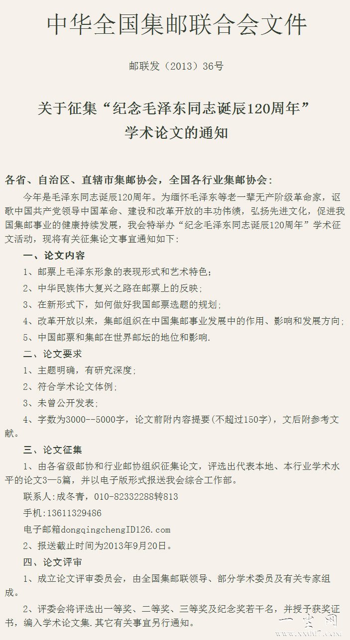 全国邮联征集“纪念毛泽东同志诞辰120周年”学术论文