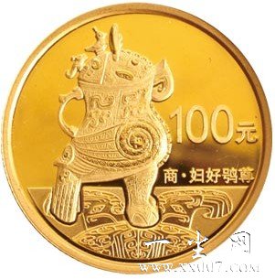 中国人民银行于2013年5月发行中国青铜器金银纪念币(第2组)一套。该套纪念币共5枚,金币2枚,银币3枚,其中1/4盎司圆形金质纪念币的背面图案为“商代妇好鸮尊”。鸮,又称枭,俗称“猫头鹰”,在商代,鸮被视为地位和权力的象征,深受商人的喜爱和崇拜,甚至还被喻为“战神鸟”,是克敌制胜的象征。尊,则是古代体型较大的盛酒器。妇好鸮尊,即为“妇好”铭文的青铜鸮尊。仿照鸮的形象制成的青铜礼器在商代晚期极为盛行。妇好鸮尊于1976年在河南省安阳市殷墟妇好墓出土,是迄今发现最早的鸟形酒尊。妇好鸮尊系商朝晚期器物,实物通高45.9厘米、口径16.4厘米、重16.7千克。周身各处分饰一条张口怒目的怪夔、一条身形卷曲的长蛇和一只圆眼尖喙、双足内屈、两翼展开作飞翔状的鸱鸮,各纹饰间还有菱形纹、大饕餮纹、兽面纹衔接,周身纹饰繁缛瑰丽,令人叹为观止。