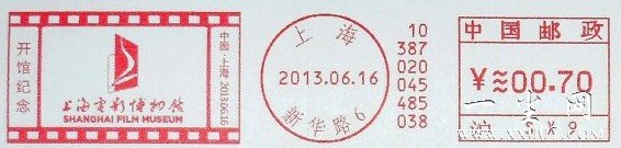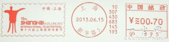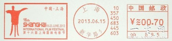2013年6月15日晚第16届上海国际电影节将正式拉开帷幕。2013年6月15日上海邮政特在上海影城旁的新华路邮局启用“第十六届上海国际电影节”邮资机符志一枚,主图为“金爵奖杯”,使用邮资机表头号为:070353 沪B95上海新华路5,有有齿、无齿两种花色。