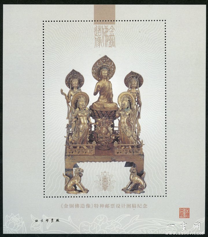 ![]() 2013年6月16日中国邮政发行《金铜佛造像》特种邮票,全套六枚,另有小型张一枚,邮票展现五代•铜鎏金观音菩萨像、宋•铜鎏金地藏菩萨像、明•铜鎏金释迦牟尼佛像、明•铜鎏金无量寿佛像、明•铜鎏金文殊菩萨像、明•铜鎏金普贤菩萨像,小型张表现内容为隋•铜鎏金佛教造像。邮票设计者为夏竞秋。 中国集邮总公司推出的邮票系列邮册中附有《金铜佛造像》特种邮票设计图稿纪念张一枚。