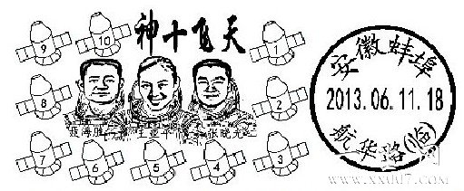 2013年6月11日,神舟十号载人飞船生工发射,安徽蚌埠邮政局为纪念此次神舟十号飞船发射成功,特刻制纪念连体戳一枚。戳图以神舟系列飞船为装饰边框,中间是航天员聂海胜、王亚平、张晓光的形象,右边是蚌埠航华路临时邮政日戳。